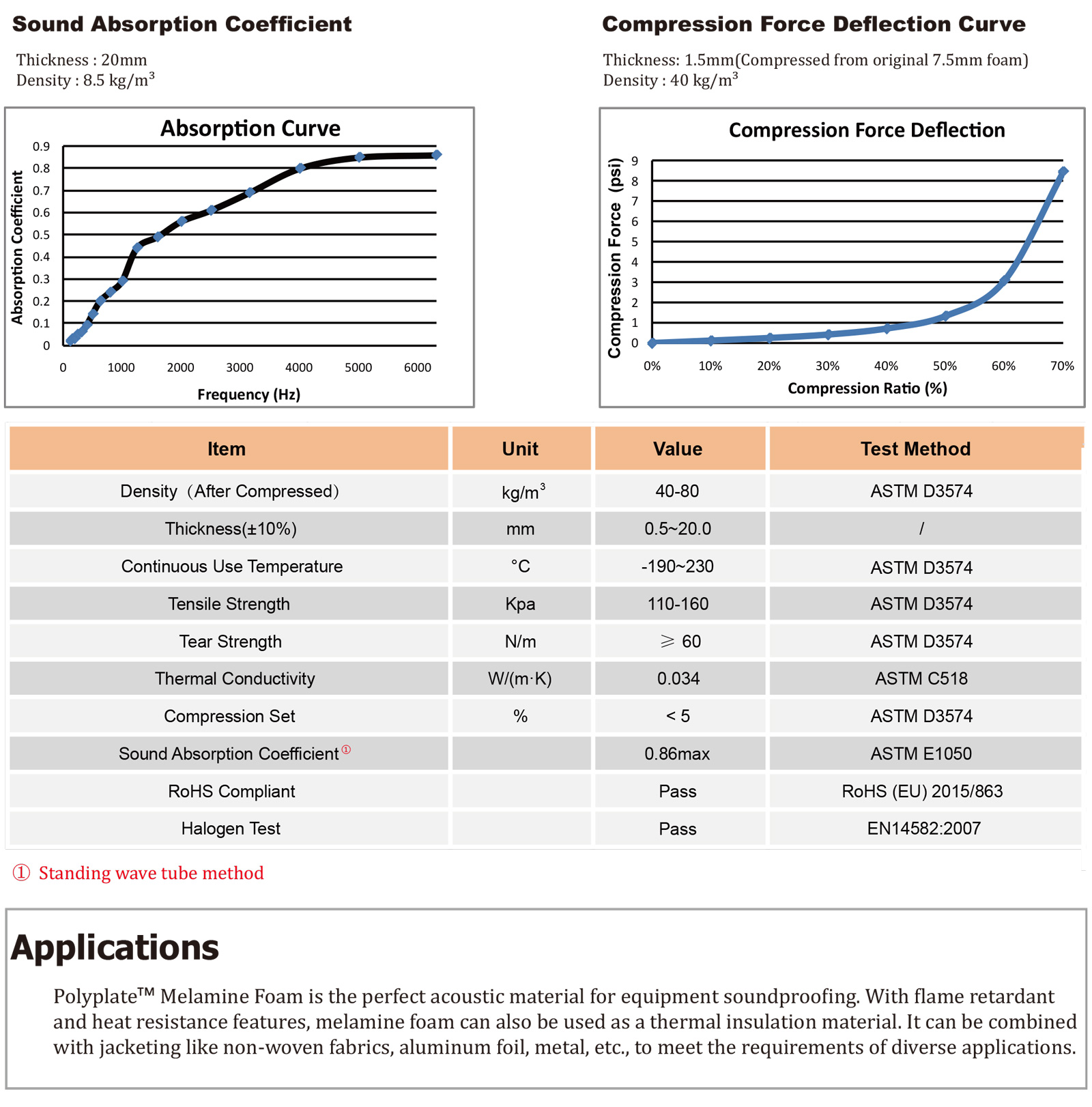 PolyplateTM 三聚氰胺泡棉是由三聚氰胺樹脂制成的熱固性聚合物。開孔具有三維網狀結構的特征。這種結構使得泡棉在阻擋噪聲和隔熱方面有效。三聚氰胺泡棉以三聚氰胺樹脂為原料,本身具有優異的阻燃性能。三聚氰胺泡棉還具有優異的耐溫性和熱穩定性。它可以在極端溫度下保持其物理特性。在電子行業,這種泡沫通常被壓縮到其原始厚度的15%-20%,以獲得最佳的吸聲效果。標準泡沫顏色為白色和灰色。其他顏色可根據要求提供。
